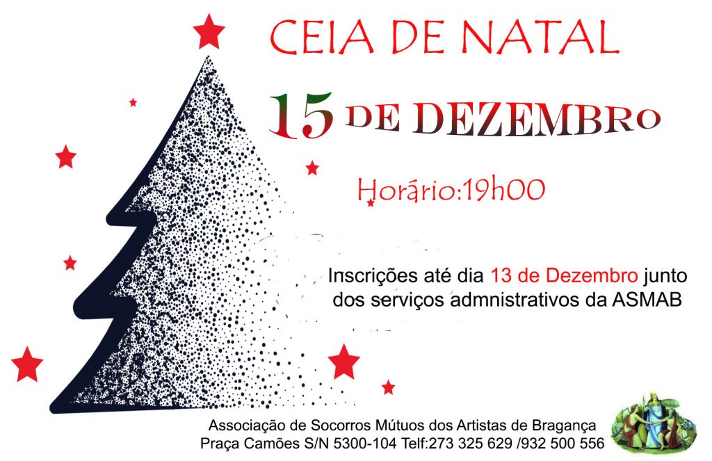 A ASMAB informa que já se encontram abertas as inscrições para a Ceia de Natal a realizar no dia 15 de Dezembro pelas 19h00 na sede das nossas instalações. Deverá formalizar a sua inscrição até ao dia 13 de Dezembro junto dos serviços administrativos da ASMAB, ou através do 273 325 629 / 932 500 556.